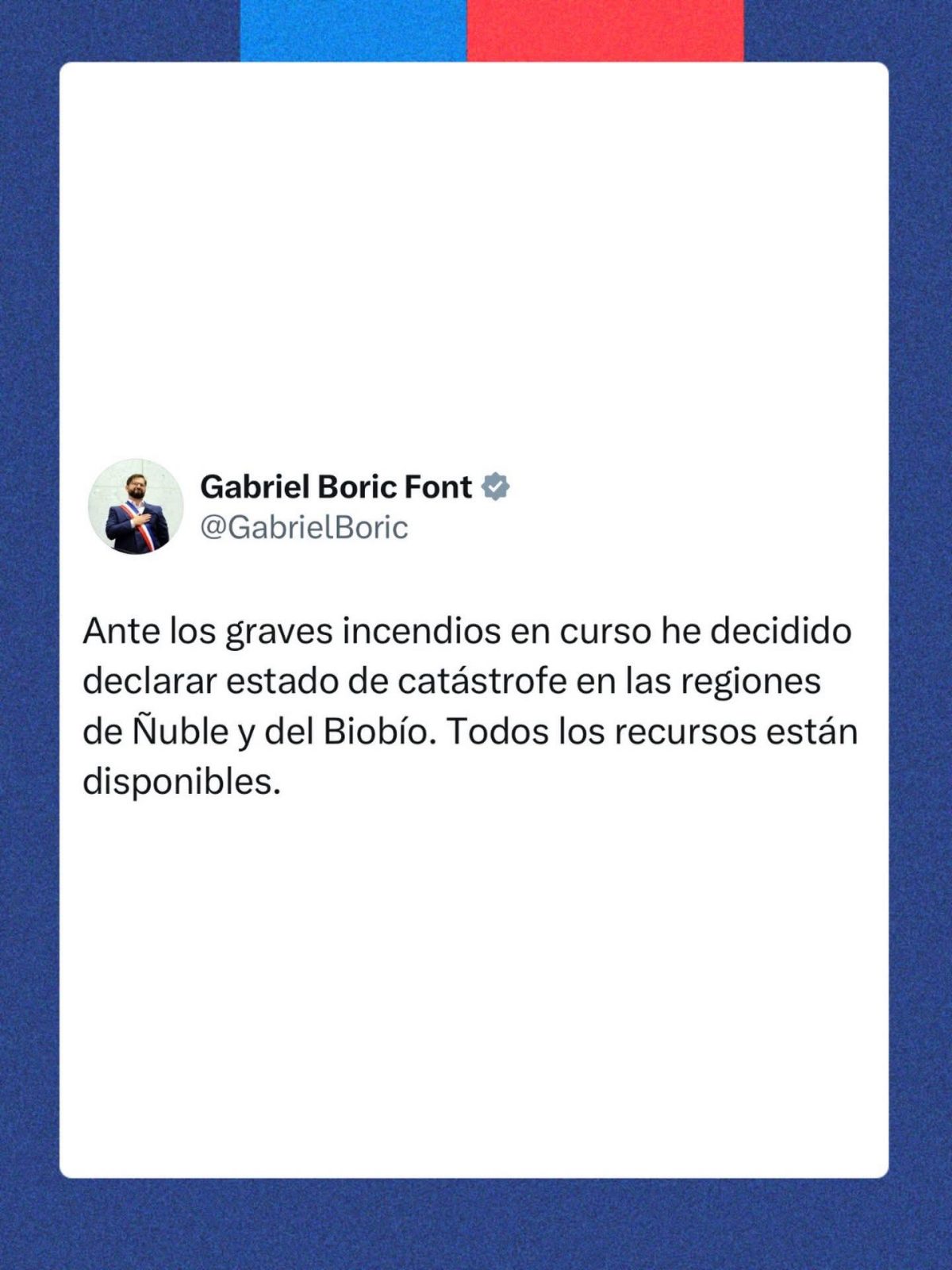 El Gobierno decretó Estado de Catástrofe para las regiones del Biobío y Ñuble debido al rápido y peligroso avance de los incendios forestales que afectan a la zona centro sur del país, situación que se ha visto agravada por las altas temperaturas y los fuertes y cambiantes vientos.