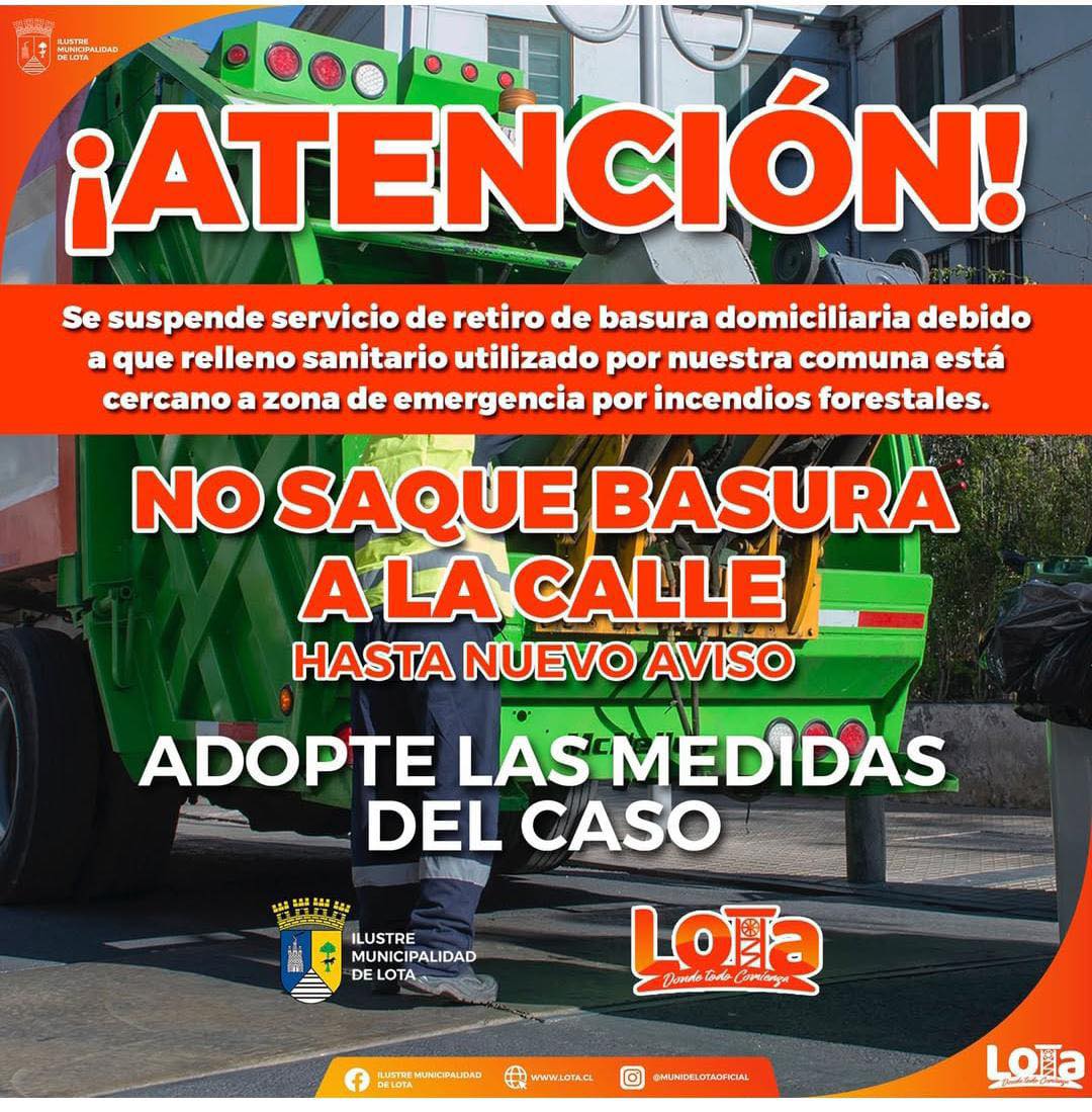 La Ilustre Municipalidad de Lota informó a la comunidad la suspensión temporal del servicio de retiro de basura domiciliaria en la comuna, debido a la emergencia por incendios forestales que afectan a la región.